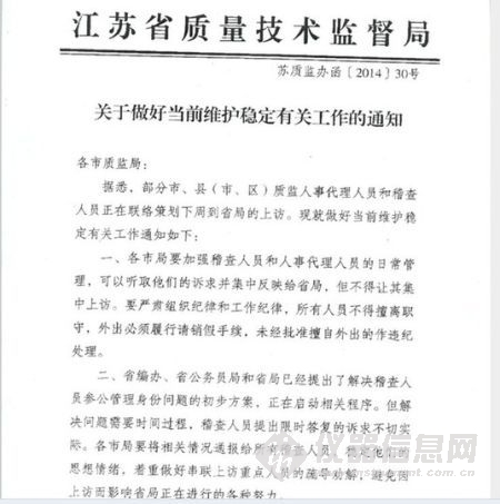 (原标题:网曝江苏质监局以维稳名义发文强行干预基层职工维权)