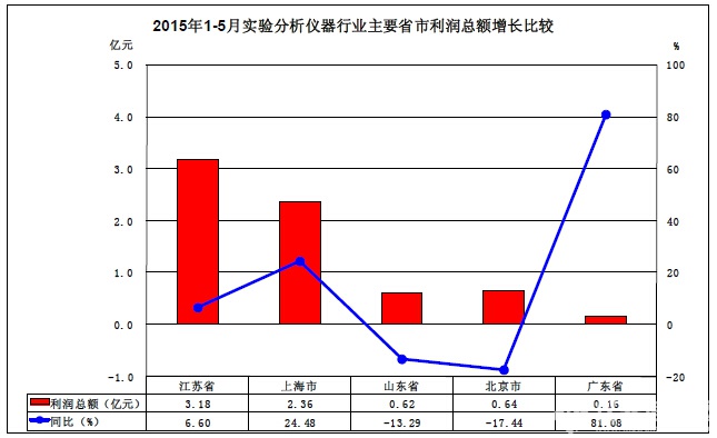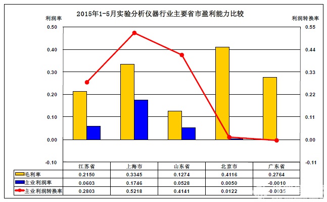 3、2015年1-5月实验分析仪器行业主要省市盈利能力比较