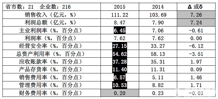 ——在11个经济运行指标中,销售收入、利润总额好于上年同期,财务费用率略好于上年同期,利润率持平,其余7个指标差于上年。其中销售收入实现111.22亿元,同比+7.26%(比1-4月上升1.30个百分点),净增7.53亿元,9个省市增幅高于行业均值。实现利润总额8.47亿元,同比+7.24%(比1-4月上升1.78个百分点), 包括上海在内的12个省市的增幅高于行业均值。