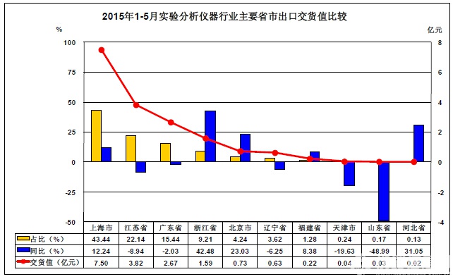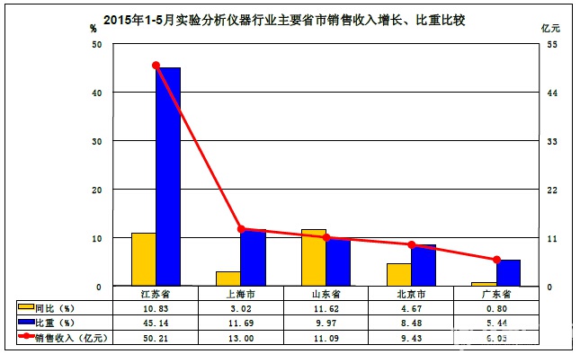 1、2015年1-5月实验分析仪器行业主要省市销售收入增长、比重比较