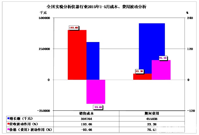 图3、全国实验分析仪器行业2015年1-5月成本、费用波动分析