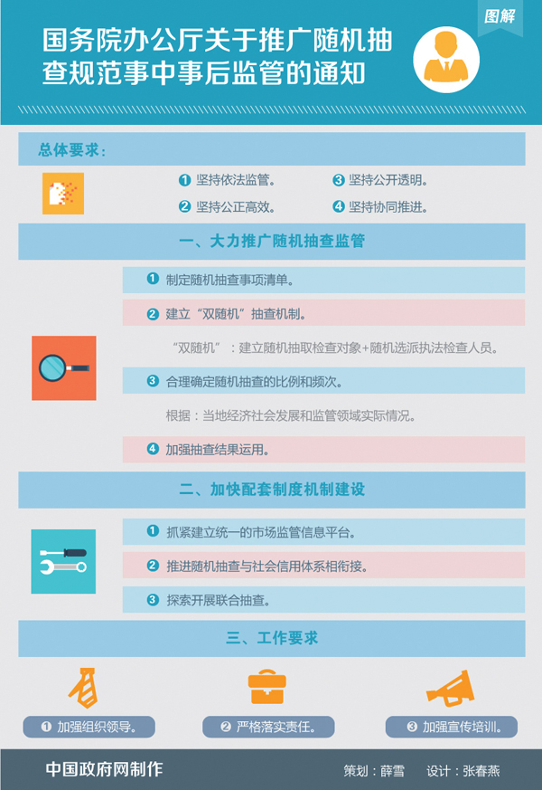 三是要在“初级版”的基础上逐步打造“升级版”。《通知》立足于让各地区、各部门先做起来,在实践中积极探索完善,提炼可复制、可推广、可操作的经验,逐步丰富、充实随机抽查制度,适时推出“2.0”和“3.0”版。 (图片来源:中国政府网)