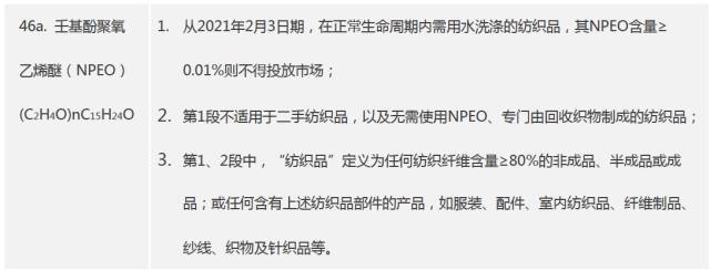 2016年1月14日,欧盟官方公布发布REACH法规的修订案(EU) 2016/26,新增REACH附录XVII条款46a,规定2021年2月3日起NPEO含量超过0.01%的纺织品将禁止投放欧盟市场。具体条款如下表所示: