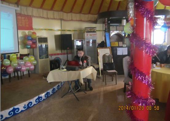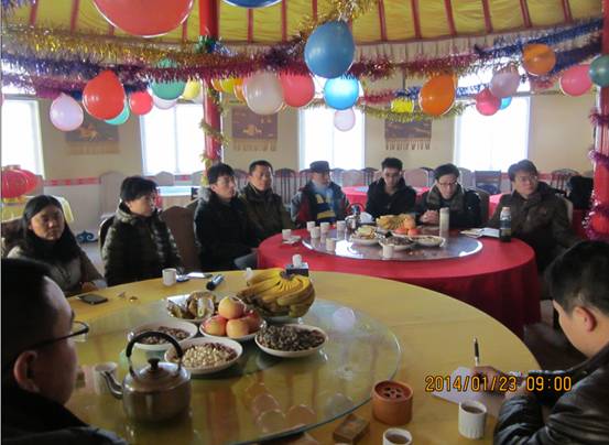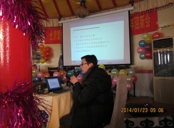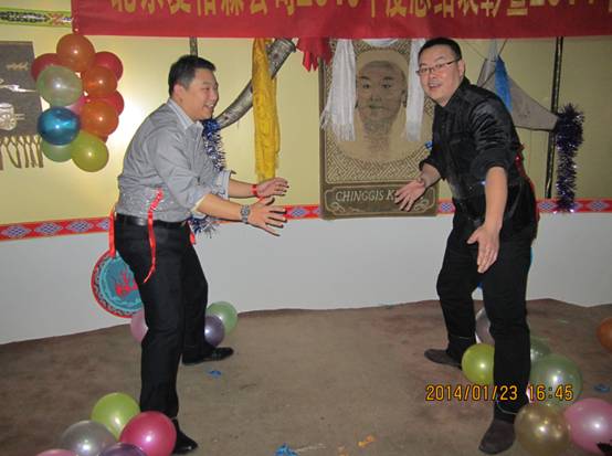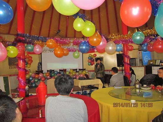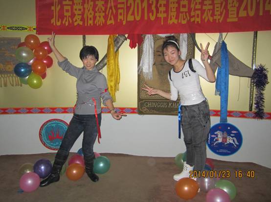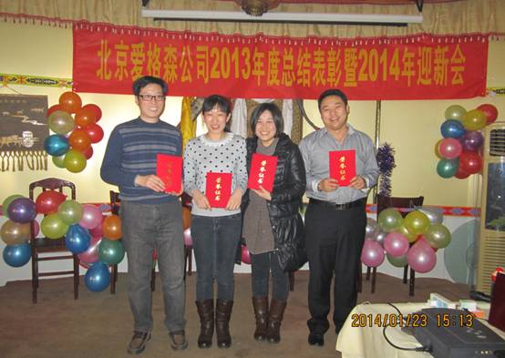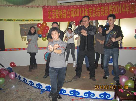 二零一四马年到,万马奔腾景壮观。2014年1月23日至24日,爱格森公司2013年度总结表彰暨2014年迎新会在北京莎日娜蒙古风情生态观光园隆重举行。公司全体员工与各级领导欢聚一堂。年会现场充满了激情、热烈、活跃的气氛。首先爱格森总经理致辞,向一年中为公司做出杰出贡献的全体员工致以新春的问候和美好的祝福;随后各部门人员分别做年终总结与计划;最后由副总经理对2013年度工作做出整体汇报,并对2014年工作做出重要部署和规划。