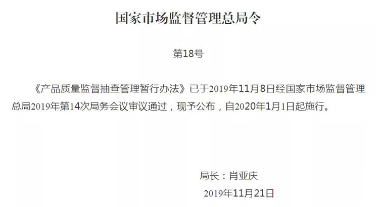 第五十六条 本办法自2020年1月1日起施行。2010年12月29日原国家质量监督检验检疫总局令第133号公布的《产品质量监督抽查管理办法》、2014年2月14日原国家工商行政管理总局令第61号公布的《流通领域商品质量抽查检验办法》、2016年3月17日原国家工商行政管理总局令第85号公布的《流通领域商品质量监督管理办法》同时废止。