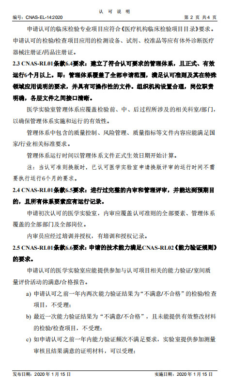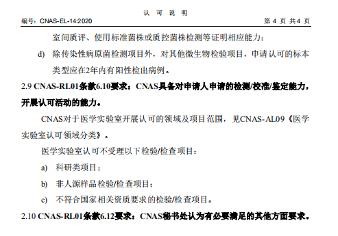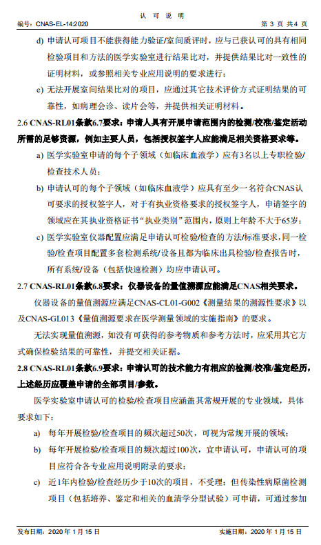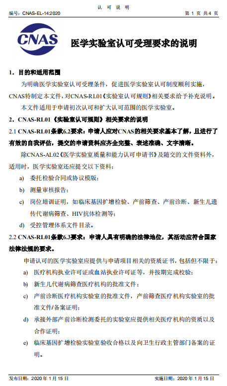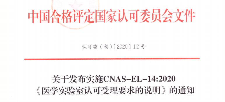 为明确医学实验室认可受理条件,促进医学实验室认可制度顺利实施,中国合格评定国家认可委员会(CNAS)组织制定了CNAS-EL-14:2020《医学实验室认可受理要求的说明》,对CNAS-RL01《实验室认可规则》第6章中关于认可条件的相关要求进行了说明。