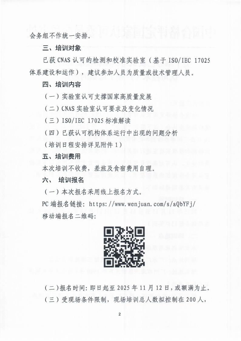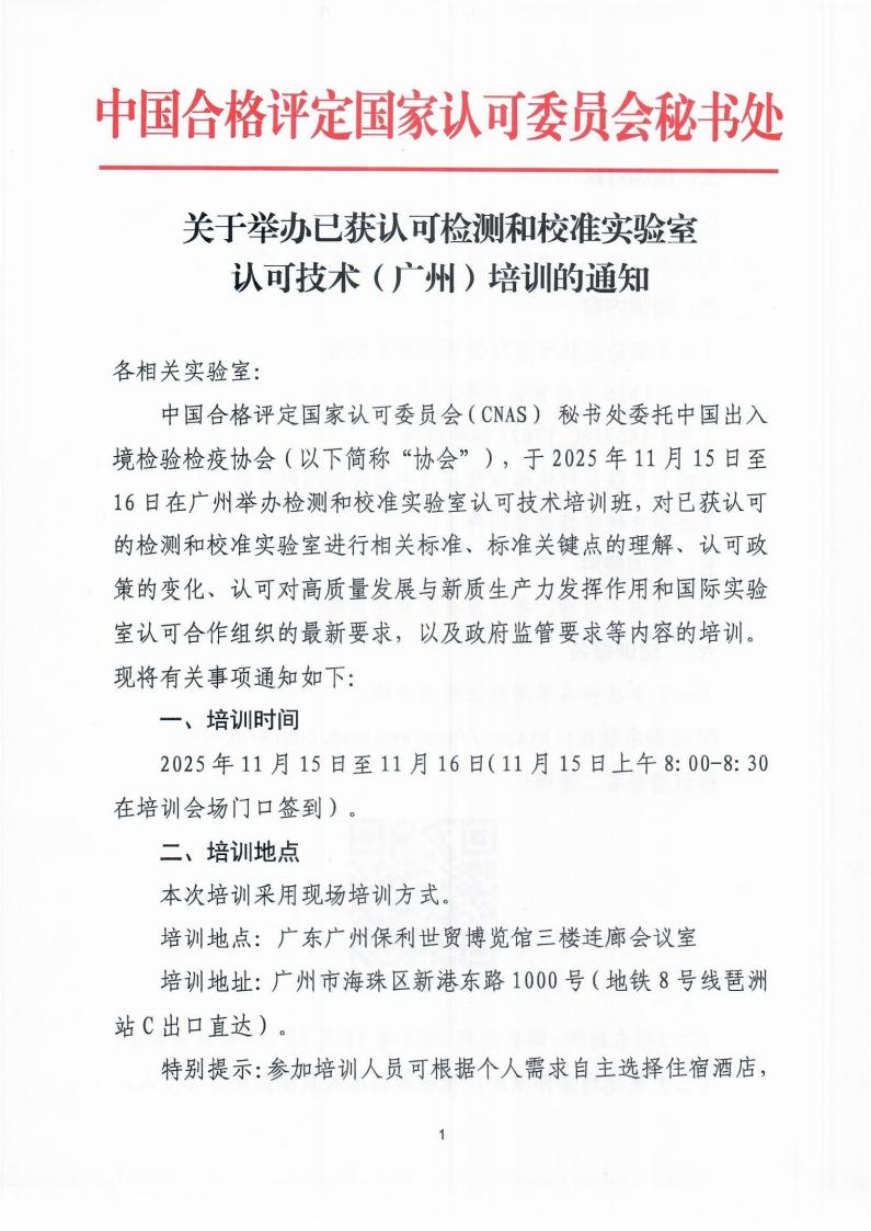 中国合格评定国家认可委员会(CNAS)秘书处委托中国出入境检验检疫协会(以下简称“协会”),于2025年11月15日至16日在广州举办检测和校准实验室认可技术培训班,对已获认可的检测和校准实验室进行相关标准、标准关键点的理解、认可政策的变化、认可对高质量发展与新质生产力发挥作用和国际实验室认可合作组织的最新要求,以及政府监管要求等内容的培训。